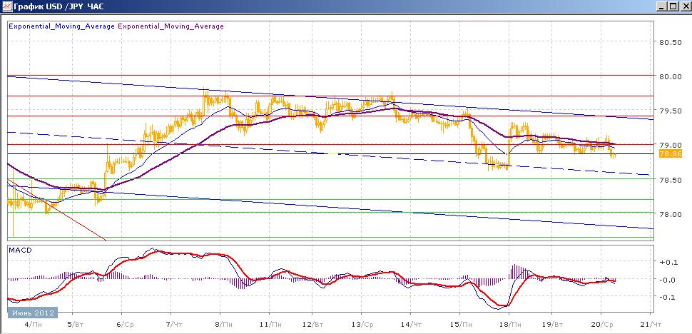 движение в рамках нисходящего канала продолжается. После показанного на открытии в понедельник гэпа, пара снова начала медленно снижаться, тестируя на прочность со второй половины понедельника поддержку на 79.00. сейчас пара торгуется с понижением, ей пока что удается закрепиться под уровнем 79.00. средние скользящие ЕМА21 и ЕМА55 продолжают постепенно снижаться. Индикаторы MACD и RSI, после слабого роста в понедельник, во вторник снова ушли ниже своих центральных линий и сегодня также снижаются. Цели вверх на сегодня — 79.00, 79.40, 79.70, 80.00. Цели вниз — 78.50, 78.20