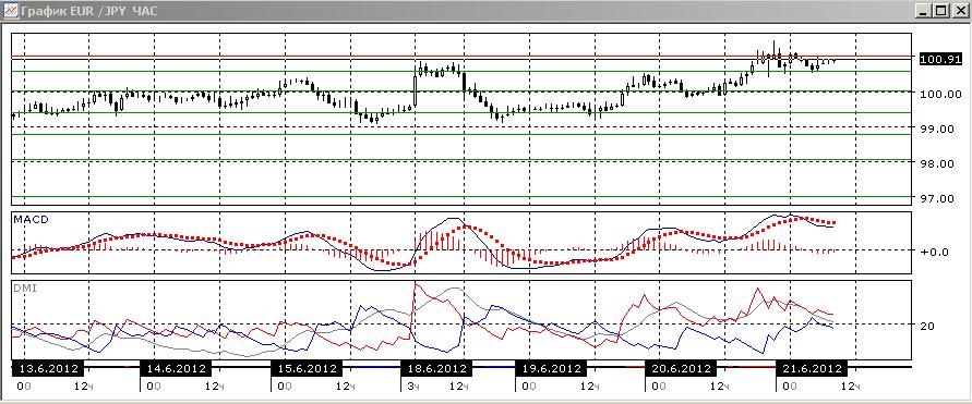 На дневном графике предпочтительным является рост, так как пара преодолевает уровень сопротивления 100,60, и индикаторы направленного движения указывают на рост: гистограмма MACD растёт, линия DM+, скорее, пересекла вверх DM-, линия MACD сохраняет положительный наклон. Предостережением для оптимизма по поводу роста выглядит большая верхняя тень вчерашней свечи и остановка на месте сегодня. Рост выглядит неуверенным.