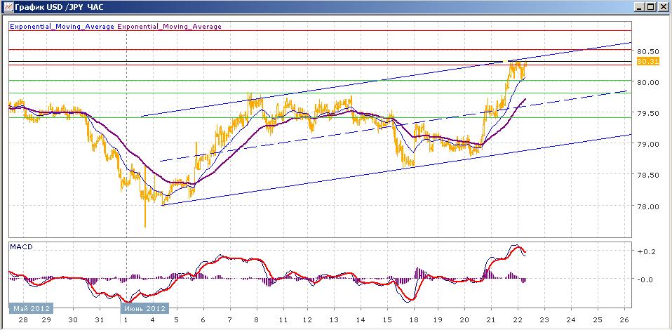 движение пары в восходящем канале продолжается. За последние два дня пара проделала путь от нижней границы канала к верхней. В среду, получив поддержку на нижней границе пара в короткий момент времени преодолела около 50 пунктов и закрылась около 79.50, вчера рост продолжился , пара преодолела среднюю линию канал, уровень 80.00 и закрылась в районе 80.30, показав более чем месячный максимум. Сегодня пара торгуется на уровне открытия, попытавшись перед этим протестировать отметку 80.00. средние скользящие ЕМА21 и ЕМА55 пересеклись вверх и растут. Индикаторы MACD и RSI со среды находятся выше своих центральных линий и сегодня снижаются. Цели вверх на сегодня — 80.50, 80.80. Цели вниз — 80.00, 79.80, 79.40