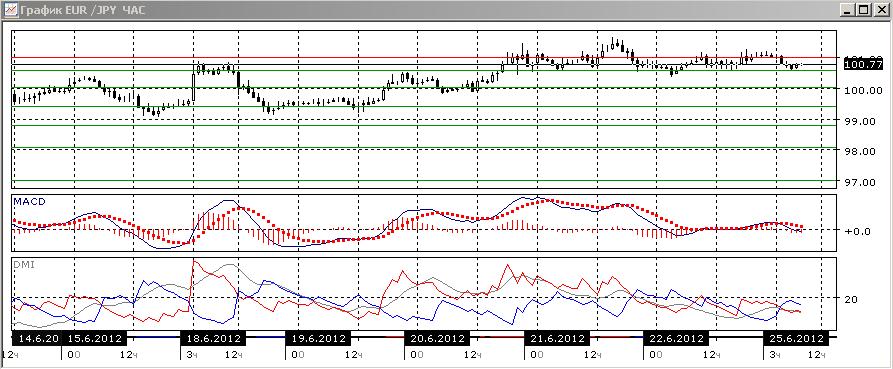 На часовом графике пара снижается, что подтверждается снижением гистограммы MACD, отрицательным наклоном линии MACD, превышением DM- над DM+. Однако если уровень 100,60 пока устоит, образуется бычье расхождение минимумов гистограммы MACD и уровня пары, что предупреждает о возможном росте.