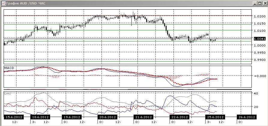 В часовом масштабе предпочтительно снижение, так как снижается гистограмма MACD, а DM- выше DM+, разворачивается линия MACD. Однако то, что пара пока не преодолевает уровень поддержки 1,0025, свидетельствует о возможном отскоке вверх.