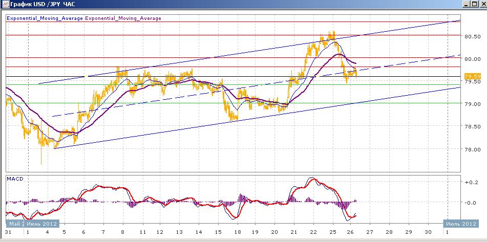 движение пары в восходящем канале продолжается. Попытки в пятницу выйти и закрепиться выше верхней границы канала были временными. Вчера пара достаточно уверено снижалась, преодолев поддержку МА55 и уйдя ниже центральной линии канала. Сегодня пара торгуется с небольшим ростом, пытаясь преодолеть всю ту же центральную линию канала. Средние скользящие ЕМА21 и ЕМА55, в целом, растут, но локально пересеклись вниз и снижаются. Индикаторы MACD и RSI с пятницы снижались и вчера ушли ниже своих центральных линий, сегодня пересеклись вверх и растут. Цели вверх на сегодня — 79.80, 80.00, 80.50. Цели вниз — 79.40, 79.00