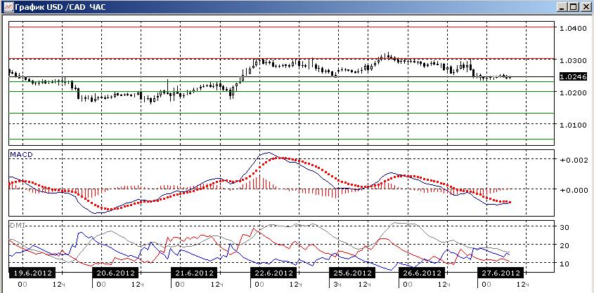 На дневном графике ситуация остаётся неопределенной: пара находится между уровнями 1,0200 и 1,0300, и сейчас движется вниз. Если рассматривать движение с 4 июня как трехволновое, то более вероятно снижение с целью около 1,0050. По индикаторам направленного движения явной тенденции нет: DM+ и DM- почти равны, рост гистограммы MACD это противоречит снижению линии MACD.