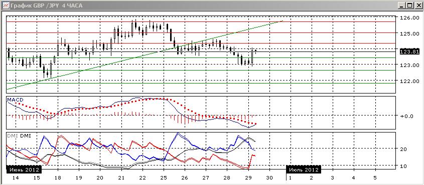 На четырехчасовом графике образовалось бычье расхождение между минимумами гистограммы MACD и пары, поэтому возможно тестирование уровня сопротивления 124,30 при продолжении роста пары. Линия MACD пока не в пользу роста, как и ADX. Предпочтений по направлению дальнейшего движения пока нет.