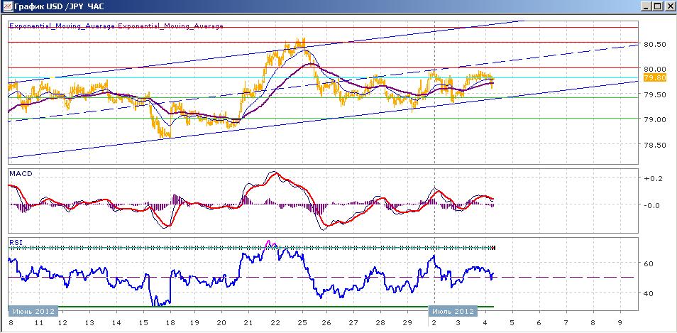 движение пары в восходящем канале продолжается, пара больше недели движется в его нижней части. С 26 июня паре не удается преодолеть сопротивление на 79.80, пара каждый раз откатывается вниз. Сегодня пара торгуется с небольшим понижением, продолжая находиться под 79.80. Средние скользящие ЕМА21 и ЕМА55 снова пересеклись вверх и растут. Индикаторы MACD и RSI вчера вышли выше своих центральных линий и сегодня пересеклись вниз и снижаются. Цели вверх на сегодня — 79.80, 80.00, 80.50. Цели вниз — 79.40, 79.00