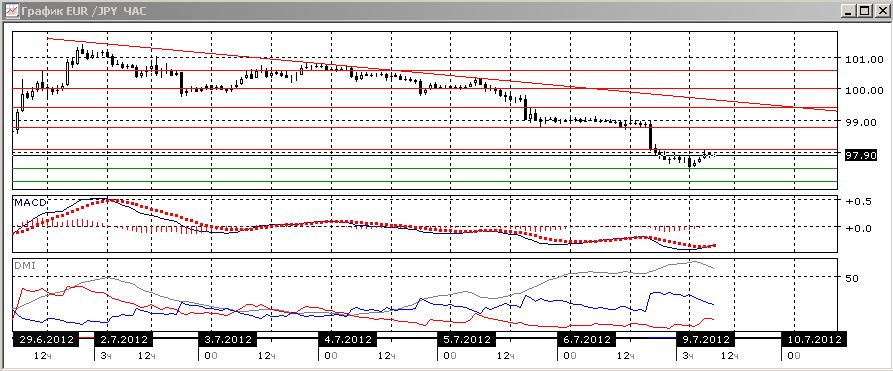 На часовом графике пара последовательно снижается. Сейчас, кажется, заканчивается коррекция к снижению, в пользу этого мнения верхняя тень предпоследней свечи. Уровнем сопротивления 98,10 рост ограничился. Предпочтительно продолжение снижения. Тенденция лучше иллюстрируется по индикатору ADX, где разрыв между DM- и DM+ остаётся довольно большим.
