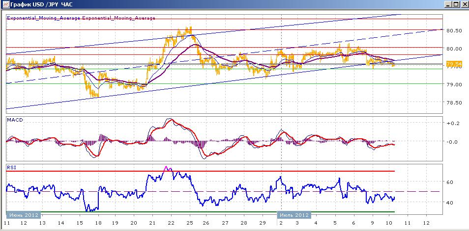 пара демонстрируется свою склонность к росту, хотя последние несколько дней она движется в коридоре 79.40-80.00. в пятницу, отскочив от сопротивления на 80.00, пара снизилась до нижней границы восходящего канала, которую упорно тестировала на прочность весь вчерашний день, закрывшись чуть ниже нее. сегодня пара торгуется на уровне открытия, закрепляясь под нижней границей канала. Средние скользящие ЕМА21 и ЕМА55 пересеклись вниз и снижаются. Индикаторы MACD и RSI в пятницу ушли ниже своих центральных линий и сегодня склонны к снижению. Цели вверх на сегодня — 79.80, 80.00, 80.50. Цели вниз — 79.40, 79.00
