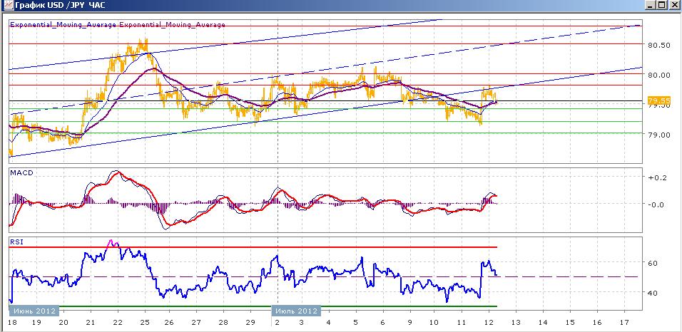 С 25 июня пара движется в коридоре с границами 79.20-80.00. в рамках этого коридора с прошлой пятницы пара снижалась, в итоге проверив вчера на прочность нижнюю границу канала, после чего достаточно резко немного подросла, добравшись до отметки 79.80. сегодня пара торгуется с небольшим понижением, получая пока что поддержку от средней скользящей ЕМА55. Индикаторы MACD и RSI вчера вышли выше своих центральных линий и сегодня снижаются. Цели вверх на сегодня — 79.80, 80.00, 80.50. Цели вниз — 79.40, 79.00