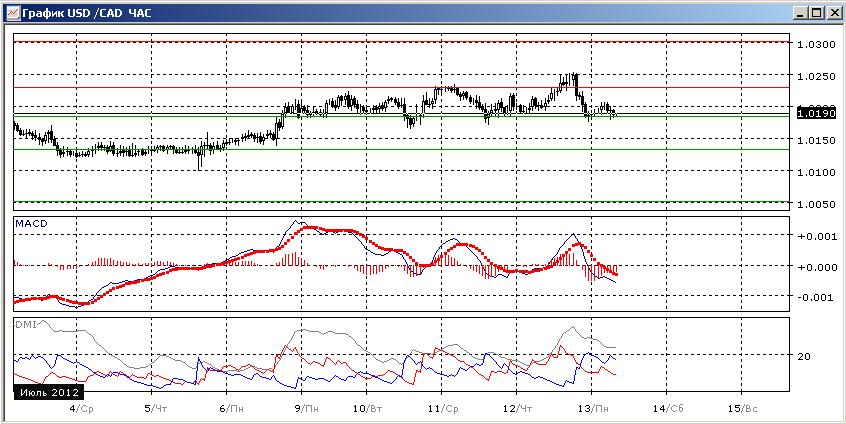 На четырехчасовом графике более вероятно снижение, судя по отрицательному наклону линии MACD и снижению гистограммы MACD. Однако по ADX тенденции еще не видно, так как ADX продолжает снижаться при равенстве DM+ и DM-. Кроме того, уровень 1,0180 уже не раз в последнее время оказывал паре поддержку. Поэтому хотя выход из канала 1,0180-1,0230 более вероятен вниз, пара может и остаться в канале.