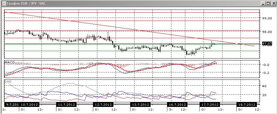 Пара немного выросла от уровня поддержки 96,60, однако нисходящий тренд с начала июля пока в силе.