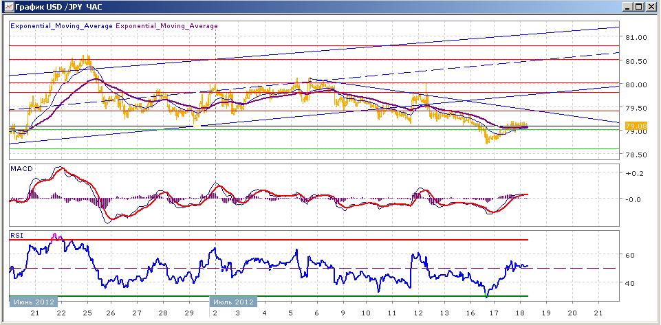 С 25 июня пара двигалась в коридоре с границами 79.20-80.00. в понедельник была предпринята попытка выхода вниз из коридора с закреплением под ним, в результате чего пара показала месячный минимум. Но к середине вчерашних торгов пара скорректировалась вверх и закрылась чуть выше уровня 79.00. Средние скользящие ЕМА21 и ЕМА55 снижаются, но готовятся к пересечению вверх. Индикаторы MACD и RSI вчера вышли выше своих центральных линий и сегодня склонны к снижению. Цели вверх на сегодня — 79.40, 79.80, 80.00, 80.50. Цели вниз — 79.00, 78.60