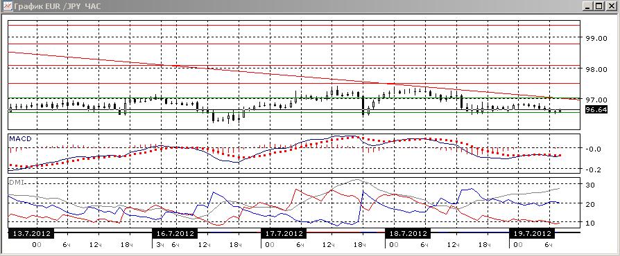 На дневном графике положение неопределенное. Пара как и ранее ограничена уровне поддержки 96,60 и нисходящим трендом. Более вероятен выход из этого треугольника вниз.