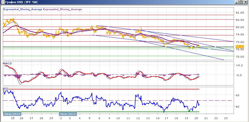 уже более двух недель пара медленно снижается. В среду пара после неоднократных попыток преодолела вниз уровень 79.00, вчера снижение продолжилось, но на отметке 78.50 пару ждала поддержка. сейчас пара торгуется на уровне открытия. Средние скользящие ЕМА21 и ЕМА55 продолжают снижаться. Индикаторы MACD и RSI в среду ушли ниже своих центральных линий и сегодня растут. Цели вверх на сегодня — 79.00, 79.40, 79.80, 80.00. Цели вниз — 78.60-78.50, 78.00