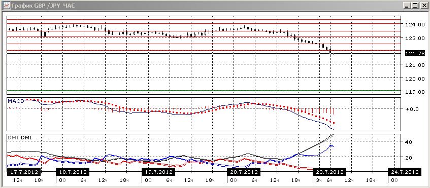 На дневном графике снижение остаётся предпочтительным. При дальнейшем снижении целью видится уровень 119,00 — в районе минимума 1 июня. Исходя из цели измеренного движения, целью представляется район 120,00. По индикаторам направленного движения снижение также предпочтительно, так как разница между DM- и DM+ увеличивается, ADX растёт, гистограмма MACD начала снижение. Также обращает на себя внимание, что рост встречает сопротивление и был довольно вялым, а снижение весьма уверенное.