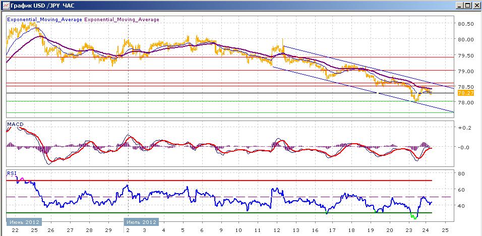 уже более двух недель пара медленно снижается. В пятницу пара все же преодолела поддержку диапазона 78.50-78.60 и усилила свое снижение вчера, достигнув сессионного минимума на 77.94. последующее восстановление затем вывело пару к отметке 78.50, но сегодня пара снова снижается. Средние скользящие ЕМА21 и ЕМА55 продолжают снижаться. Индикаторы MACD и RSI в прошлую среду ушли ниже своих центральных линий и сегодня склонны к снижению. Цели вверх на сегодня — 78.50-78.60, 79.00. Цели вниз — 78.00, 77.64 (минимум от 1 июня)