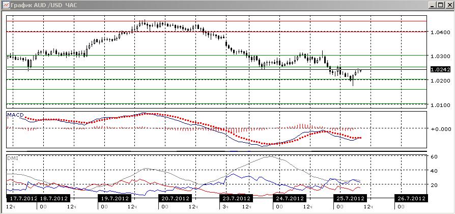 На четырехчасовом графике также более вероятно снижение, но рост гистограммы MACD, образование бычьего расхождения между минимумами гистограммы MACD и пары, а также возможное формирование разворотной свечной комбинации делают ситуацию неопределенной. Возможно, для коррекции вверх уровень 1,0250 будет пределом. По наклону вниз линии MACD и большому превышению DM- над DM+, тенденцией остаётся снижение.