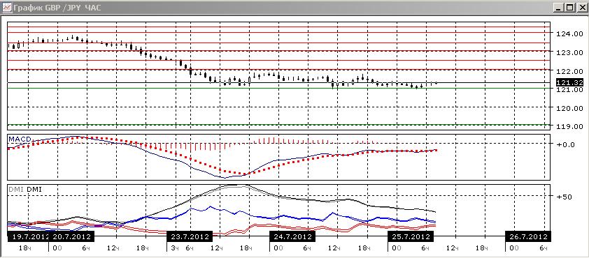 На четырехчасовом графике снижение остановилось перед уровнем 121,00, на котором пара получает поддержку. Остановка на уровне привела к росту гистограммы MAC, однако из формирующего клина больше вероятности выйти вниз. По ADX тенденция к снижению является очень сильной.