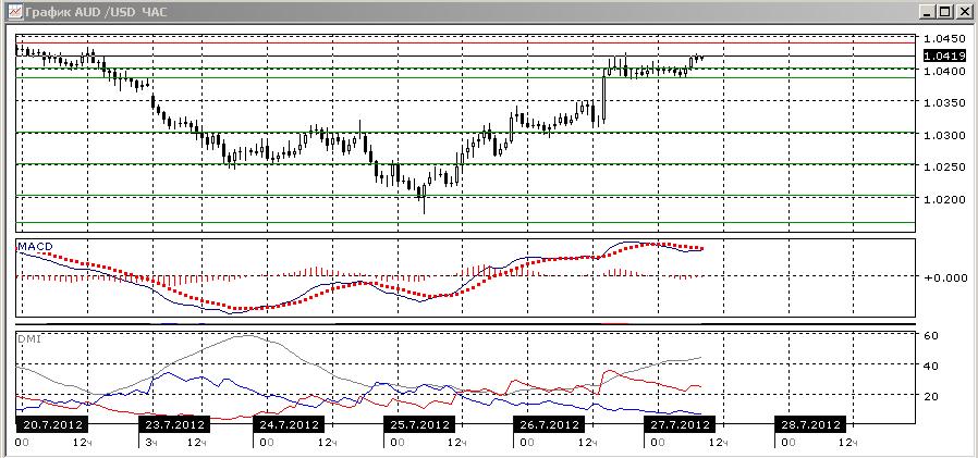 На часовом графике скорее можно говорить о флэте, так как пара колеблется около уровня 1,0400. Предпочтительным является продолжение роста, но уровень 1,0440 пара может и не преодолеть.
