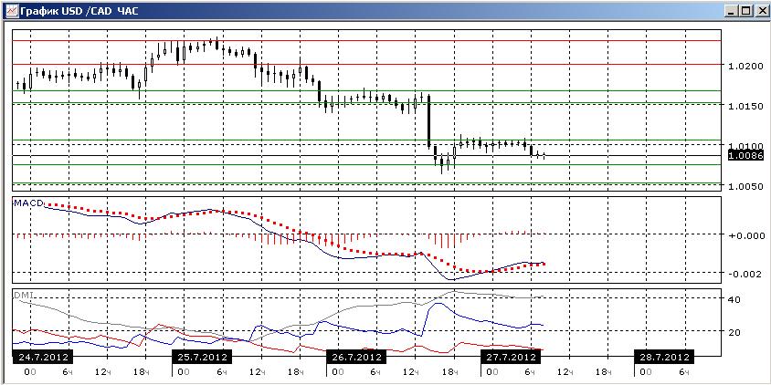 На четырехчасовом графике пара довольно явно снижается. Коррекция к снижению, кажется, закончилась, и снижение продолжается. Индикаторы направленного движения подтверждают тенденцию: ADX растёт при очень большом превышении DM- над DM+, линия MACD имеет отрицательный наклон, рост гистограммы MAD не привёл к росту пары. Тем не менее, на уровне предыдущего относительно минимума и на уровне 1,0050 пара может получить сильную поддержку.