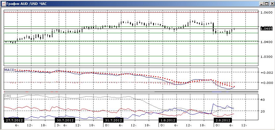 На четырехчасовом графике пара уже развернулась к снижению кроме того, что последовательность относительных минимумов и максимумов пары теперь снижается, тенденция подтверждается и индикаторам направленного движения: гистограмма MACD снижается и находится в отрицательной зоне, линия MACD имеет увеличивающийся отрицательный наклон, линия DM- пересекла вверх DM+. Отскок от уровня 1,0460 пока не выходит за рамки коррекции к снижению.