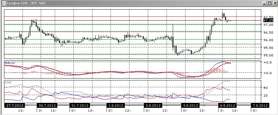 По индикаторам направленного движения тенденции нет: росли гистограммы MACD и положительный наклон линии MACD показывают на начало роста, а снижение ADX с остающимся превышением DM- над DM+ это пока не подтверждает. Если пара не преодолеет уровень 97,00, то возможен откат назад к 95,00.