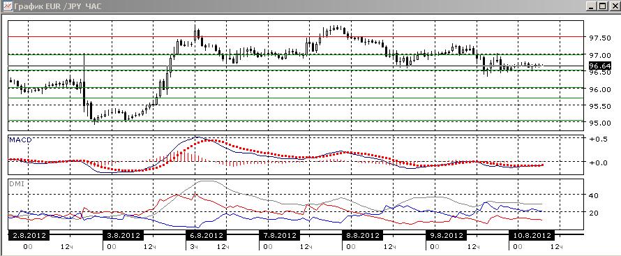 На четырехчасовом графике предпочтительно продолжение снижения пары, как уровень пары постепенно снижается, а коррекционные движения вверх слабые. По индикаторам направленного движения тенденцией также является снижение: гистограмма MACD снижается, DM- выше DM+, линия MACD имеет отрицательный наклон. Препятствием для продолжение снижения может выступить уровень 96,50, который пара пока не преодолела.