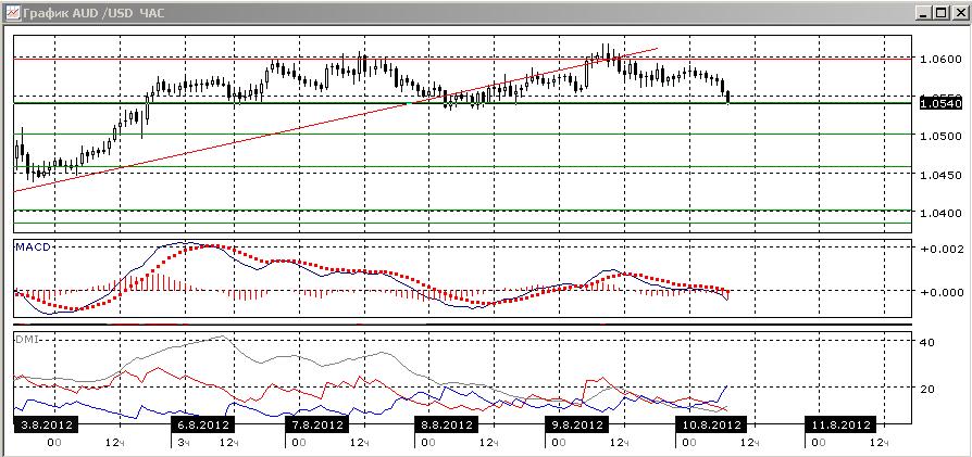 По ADX тенденция к росту остаётся сильной, разрыв между DM+ и DM- большой, ADX продолжает рост. Однако линия MACD уже перешла к горизонтали, что вместе со снижением гистограммы MACD делает снижение более вероятным. Рассматривать снижение, наверно, оправдано только в случае если пара надежно преодолеет вниз уровень поддержки 1,0540.