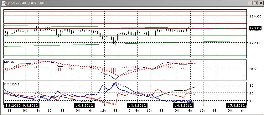 На часовом уровне остановка пары перед уровнем 123,00 привела к образованию медвежьего расхождения между максимумами пары и гистограммы MACD, что вместе с устойчивостью уровня говорит о возможности снижения. По ADX тенденция к росту довольно сильная, он выглядит предпочтительным направлением движения.