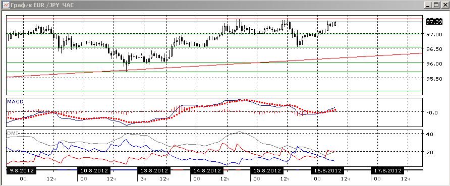 На четырехчасовом графике также предпочтителен рост, так как растёт уровень пары, линия MACD имеет положительный наклон, а ADX превышение DM+ над DM- увеличивается. Наличие вблизи уровня сопротивления 97,50 и образование медвежьего расхождения между максимумами гистограммы MACD и уровня пары склоняет к тому, чтобы дождаться преодоления предыдущего максимума.