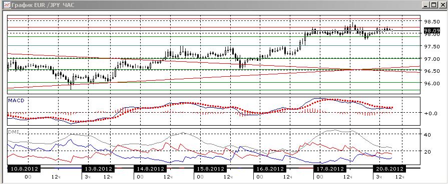 На часовом графике предпочтителен рост, судя по росту пары и по показателям индикаторов направленного движения: росту гистограммы MACD, развороту вверх линии MACD, превышению DM+ над DM-. Однако рост слабый, и его можно рассматривать как движение вверх в узком канале 97,85-98,25 начиная с 17 августа. Верхняя граница этого канала, хотя и неоднократно тестировалась недавно, пока устойчива. Скорее, пока движение в канале продолжится.
