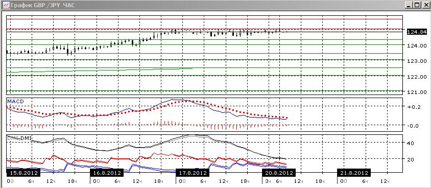 На четырёхчасовом графике рост также предпочтителен, однако пара пока остановилась перед уровнем 125,00. Скорее, пара преодолеет его вверх, так как заметного снижение от него пока не было. За счёт довольно длительной остановки на уровне к горизонтали перешла линия MACD, а гистограмма MACD сейчас на околонулевом уровне. Тенденция к росту подтверждается значительным превышением DM+ над DM- и высоким уровнем ADX, который продолжает расти.