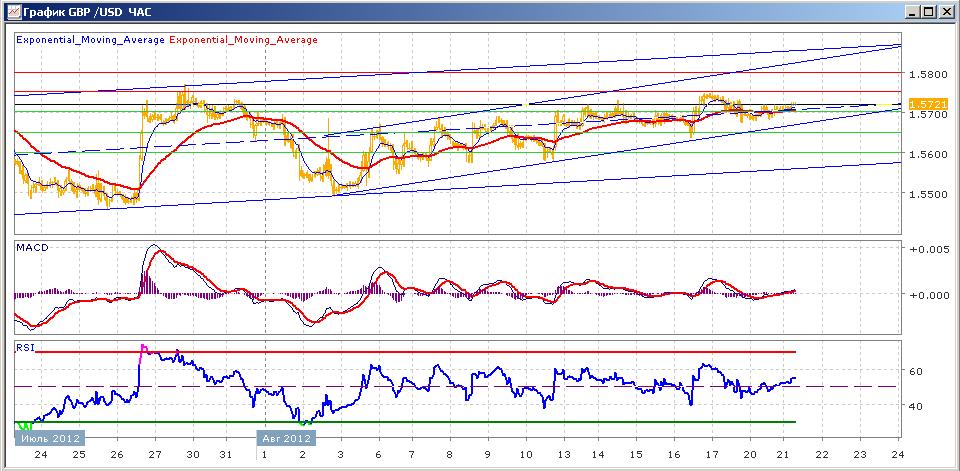 пара продолжает свое движение в восходящем канале, начатое 12 июля. С 3 августа в рамках этого движения образовался другой восходящий канал, в котором пара сейчас и пребывает. В пятницу пара снижалась, закрыв в итоге неделю на 1.5700. вчера торговля была была спокойной, пара колебалась вокруг 1.5700. сегодня пара немного растет. Средние скользящие ЕМА55 и ЕМА21 в целом продолжают расти. Индикаторы MACD и RSI сегодня снова вышли выше своих центральных линий и слабо растут. Цели на сегодня вверх — 1.5750, 1.5800. Движение вниз будет направлено на 1.5700, 1.5650
