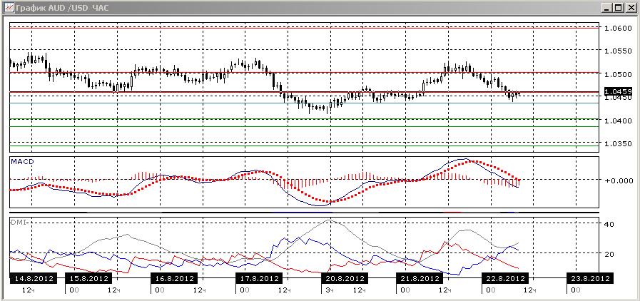 На четырехчасовом графике пара снижается от уровня 1,0500, по индикаторам тенденция видна по снижению гистограммы MACD и превышением DM- над DM- , хотя их уровень и близок. Продолжающееся снижение ADX показывает, что скорее вероятно движение в пределах прежних уровней поддержки/сопротивления.