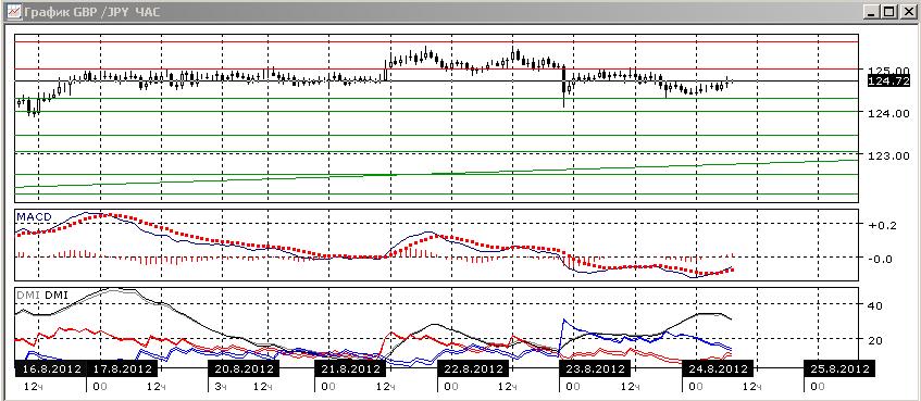 На часовом уровне пара, скорее находится в коридоре 124,30—125,00. Выраженной тенденции, судя по противоречиям в показаниях индикаторов направленного движения, а также образованием свечей «дожи», сейчас нет.