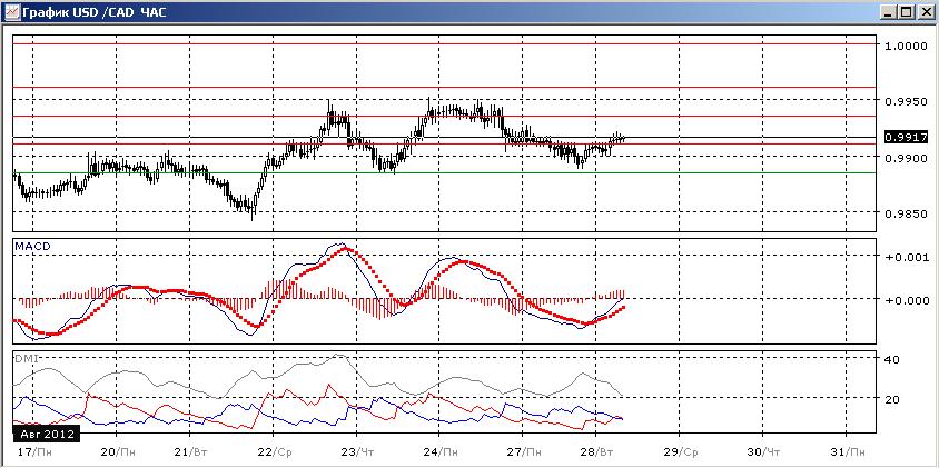 На четырехчасовом графике пара, скорее, во флэте: с середины августа уровень пары изменился мало, движение ограничивается уровнями 0,9885 и 0,9935. По индикаторам направленного движения обычная для флэта ситуация, когда DM+ и DM- близки, ADX снижается, а отрицательный наклон линии MACD противоречит росту гистограммы MACD. Предпочтений по направлению дальнейшего движения в этом масштабе пока нет.Подобная картина на часовом графике: пара тяготеет к уровню 0,9910, равны DM- и DM+, гистограмма колеблется около нуля, а линия MACD периодически меняе наклон. Предпочтений в этом масштабе также нет. В рамках движения в канале может быть достигнут уровень 0,9935.