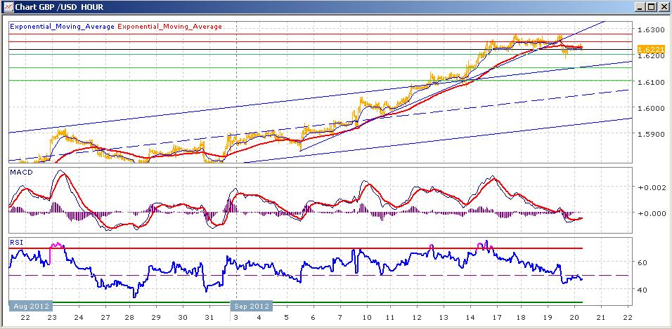 рост пары приостановился. С 14 сентября пара торгуется в диапазоне 1.6200-1.6280. вчера пара преодолела восходящую поддержку и снизилась снова к 1.6200, закрывшись в итоге в районе 1.6220. сегодняшние торги проходят на уровне открытия без какой-либо выраженной динамики. Средние скользящие ЕМА55 и ЕМА21 в целом все так же направлены вверх, но замедлились и пересеклись вниз. Индикаторы MACD и RSI, после долгого пребывания вверху, вчера ушли ниже своих центральных линий и сегодня слабо растут. Цели на сегодня вверх — 1.6250, 1.6280, 1.6300 Движение вниз будет направлено на 1.6200, 1.6150