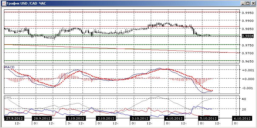 На четырёхчасовом графике выраженного снижение пары, что подтверждается индикаторами направленного движения, между которыми нет противоречий. На часовом графике предпочтительно снижение так как после остановки пары ниже 0,9810 коррекции вверх не наблюдалось. Однако уровень 0,9810 — сильный, и пока нельзя сказать, что он вполне преодолён.