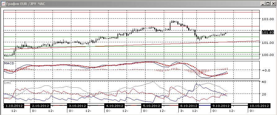 На часовом графике скорее можно говорить о коррекции к предыдущему снижению. Пока пара растёт, ближайший уровень сопротивления — 102,00. Скорее пара его достигнет. Далее рост может остановиться, судя по равенству DM- и DM+ и резкому снижению ADX.