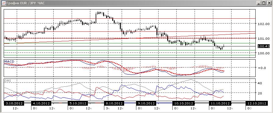 На четырехчасовом графике пара перешла к снижению, по индикаторам направленного движения это иллюстрируется превышением DM- над DM+ при росте ADX, отрицательным наклоном линии MACD при отсутствии роста гистограммы MACD, находящейся в отрицательной зоне. На уровне поддержки 100,15 пара недавно получила поддержку, но скорее снижение продолжится. Целью сейчас является уровень поддержки 99,80.