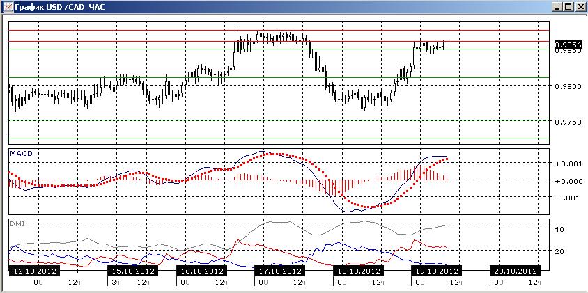На часовом графике предпочтительным сейчас кажется рост, так так тенденция к тему хорошо видна по отсутствию заметных коррекций. Однако ближайший целевой уровень — 0,9875, довольно близко, а уровень сопротивления представляется достаточно сильным. Стоит подождать развития событий.