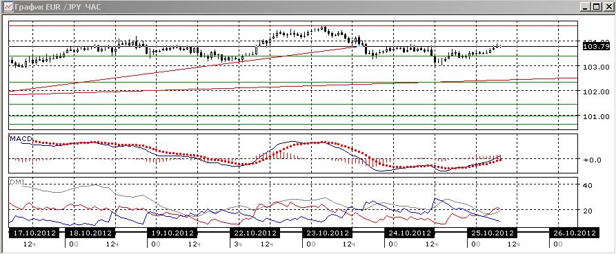 На четырехчасовом графике пара остается в пределах 103-104. По индикаторам направленного движения тенденции не видно, так как небольшое снижение линии MACD противоречит небольшому росту гистограммы MACD, а DM+ и DM- равны. Предпочтительного направления дальнейшего движения в этом масштабе не видно.
