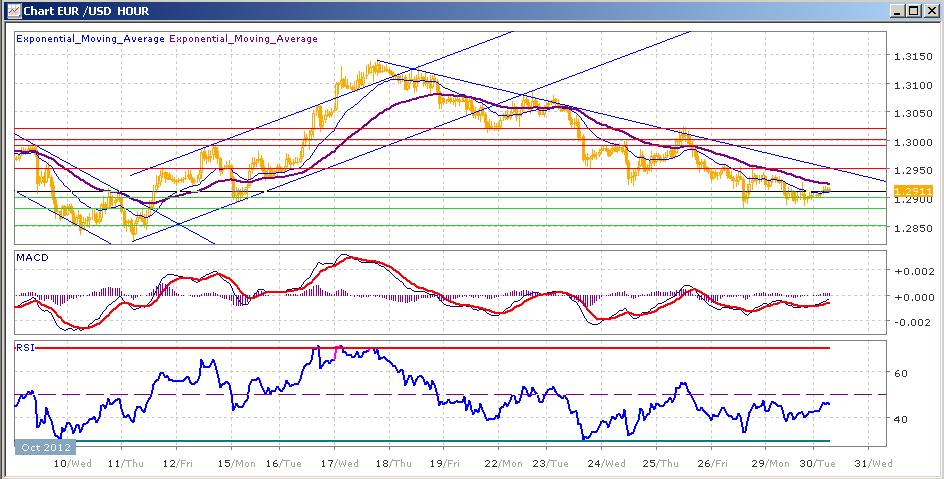 начатое 17 октября снижение пары продолжается. После неудачной попытки закрепиться выше 1.3000 в четверг пара снова пошла на снижение, закрыв прошедшую неделю на 1.2940. вчера снижение было продолжено, пара неоднократно пыталась преодолеть уровень 1.2900, но безуспешно. Сегодняшние торги проходят с небольшим ростом. Средние скользящие ЕМА21 и ЕМА55 продолжают снижаться. Индикаторы MACD и RSI с четверга находятся ниже своих центральных линий и сегодня растут. На сегодня цели вверх — 1.2950, 1.2990-1.3000, 1.3020 Цели вниз на сегодня — 1.2900, 1.2880, 1.2850.