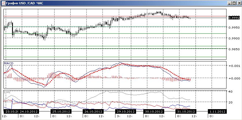 На четырехчасовом графике пара снижается после превышения уровня паритета. В пользу снижения — отрицательный наклон линии MACD и снижение гистограммы MACD. По ADX тенденцией остаётся рост. Судя по росту относительных минимумов и максимумов пары, также предпочтителен рост.