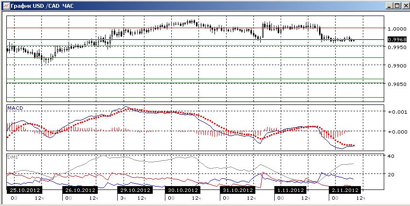 На четырехчасовом графике пара находится выше уровня поддержки 0,9950. По индикаторам направленного движения снижение предпочтительно, в пользу снижения — отрицательный наклон линии MACD и снижение гистограммы MACD. По ADX тенденцией также стало снижение из-за превышения DM- над DM+. Однако уровень 0,9950 пока не преодолён, и стоит дождаться развития событий.