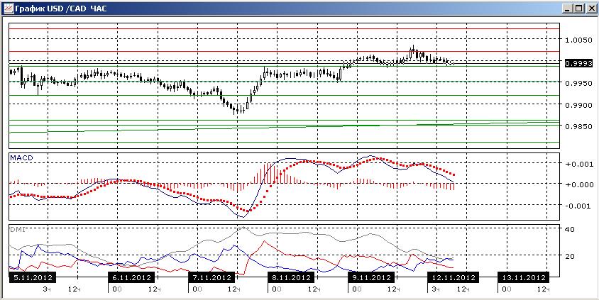 На четырехчасовом графике пара снижается после достижения максимумов конца октября-начала ноября. Пока пара выше уровня поддержки 0,9985. Предпочтительного направления движения в этом масштабе, скорее, нет. Это подтверждается и противоречием в показаниях индикаторов направленного движения: по ADX пара растёт, снижение гистограммы MACD и возможный разворот линии MACD к снижению показывают на возможности снижения.