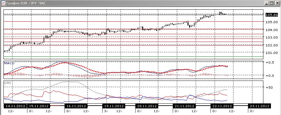 На часовом графике рост замедлился, и по итогам начала четверга пара почти не выросла, откатившись от достигнутого максимума выше 106,00. О возможном снижении предупреждает разворот вниз линии MACD и снижение гистограммы MACD. Коррекция вполне возможна.