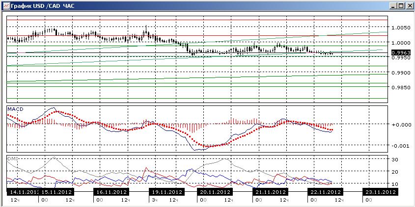 На часовом графике немного более предпочтительно снижение, но нахождение пары в узком канале 0,9950-0,9985 в течение двух дней показывает, что пока тенденции нет. Флэт подтверждается и по индикаторам направленного движения, хотя по небольшому превышению DM- над DM + и тому, что пара находится около нижней границы канала, немного более предпочтительно снижение.