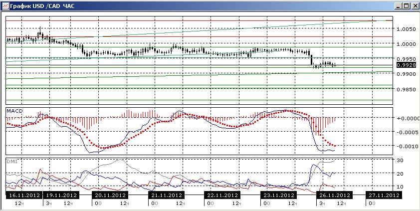 На четырехчасовом графике после преодоления уровня 0,9950 пара остановилась около уровня 0,9920. По индикаторам направленного движения снижение подтверждается, и оно является предпочтительным направлением дальнейшего движения.