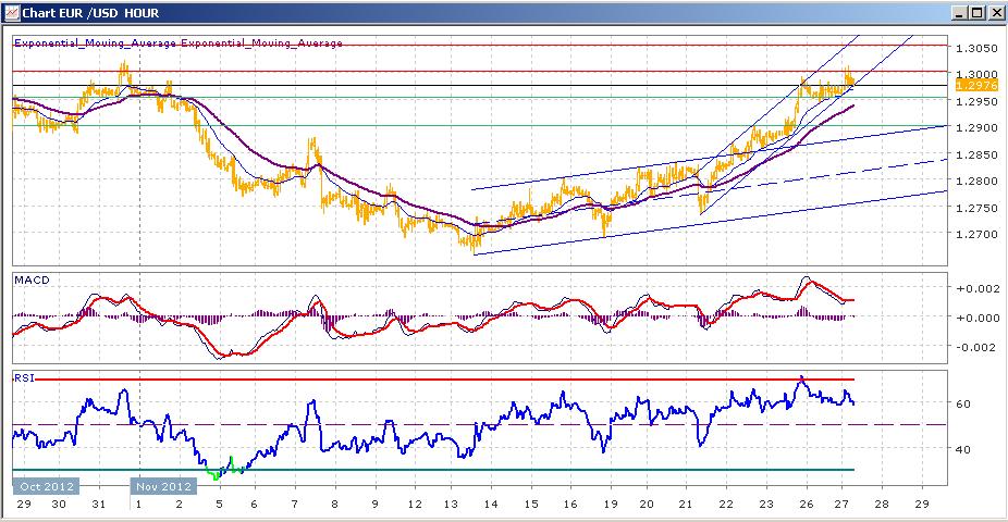 рост пары, начатый 13 ноября, продолжается. В пятницу пара преодолела уровень 1.2950 и закрыла неделю чуть ниже 1.2980. вчера пара торговалась в достаточно узком диапазоне 1.2950-1.2980, получая поддержку от 12950 и восходящей средней ЕМА21. Сегодняшние торги проходят с ростом пары, которая на новостях по Греции показала максимум сессии выше 1.3000 впервые с 31 октября, сейчас пара торгуется ниже 1.3000. Средние скользящие ЕМА21и ЕМА55 продолжают расти. Индикаторы MACD и RSI со среды находятся выше своих центральных линий и сегодня склонны к снижению. На сегодня цели вверх — 1.3000, 1.3050. Цели вниз на сегодня — 1.2950,1.2900.