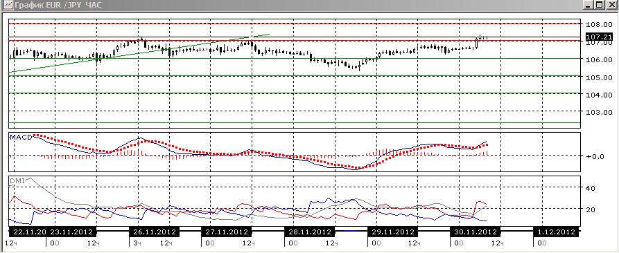 Медвежье расхождение наблюдается и на часовом графике. Хотя пара начала рост на новости о принятии правительством Японии мер поддержки экономики, возможно эта информация уже отыграна. Пара, скорее, вернётся обратно в канал 106-107, оправданной целью видится его середина.